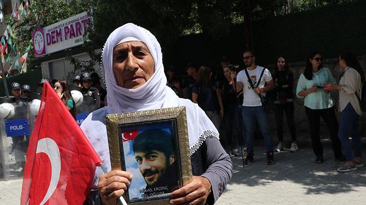 Van’da dağa kaçırılan çocukları için eylem yapan ailelerin, Halkların Eşitlik ve Demokrasi Partisi’nin (DEM Parti) il binası önündeki eylemi sürüyor. Eyleme oğlu Mikail için katılan Gevez Erdinç, oğluna teslim ol çağrısında bulundu.