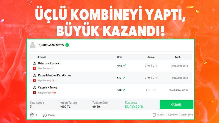 Bir Misli.com üyesi 3 maçlık kombine yaparak büyük orandan kazandı. Pazartesi ve Salı günlerini kapsayan 3 maçlık kupon, 40.29 oranla 1.000 TL’ye 36.910 TL kazandırdı.